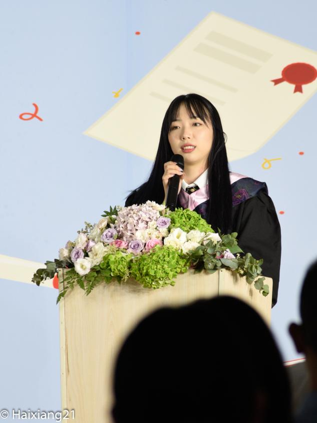 最后她代表所有的毕业生祝愿亲爱的老师们工作顺利,祝福年轻的母校更加美丽,